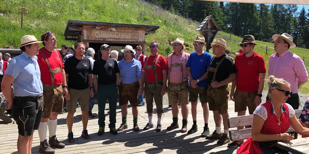 Pöllinger Hüttenkirchtag gemeinsam mit der Schuhplattlergruppe Sattendorf, dem Trio MOS und dem Familienquartett Kogler, das seinen ersten öffentlichen Auftritt bravourös absolvierte. Traumhaftes Wetter und dann wird auch unser lieber Freund und Hüttenwird Charly Peternell selbst aktiv, schwingt seine Kochlöffel und unterstützt uns Sänger mit seinem wunderbaren Tenor. 10 Jahre Hüttengastronomie vom Feinsten, wir gratulieren !!!